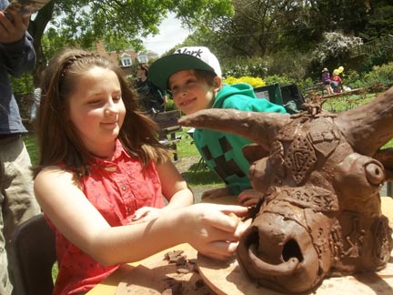 Had great fun working with the good folk of Ledbury as part of the town’s Ox Roast Coronation Weekend. On Saturday we set up camp in the Walled Garden inviting passing visitors and members of the community to help us construct a terracotta Ox’s head. Once the beast has been fired we’ll take a photo and post it here as well as displaying the sculpture in Priory Dry Cleaners shop window in Ledbury high street. On Sunday we offered members of the public the opportunity to make a pot on the potter’s wheel to take away and paint at home.