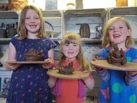 Here are three young potters proudly displaying their handywork. These fantastic potter’s wheel creations were produced earlier this week at one of our regular children’s pottery workshops held every school holiday.