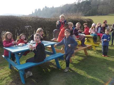 Grace and her birthday guests enjoy party food on the pottery lawn having made colourful critters as part of her 7th birthday celebrations. So nice for the children to to be able to sample the spring-like herefordshire air after their pottery session.