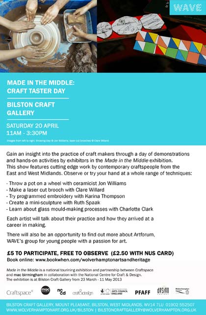 We were hired by Wolverhampton Art Gallery to offer drop-in potter’s wheel tasters to celebrate the launch of the Craft Open West Midlands exhibition.