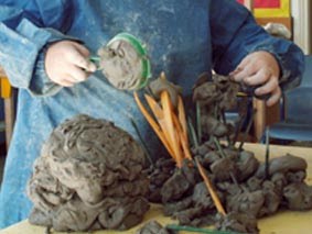 On Thursday, the Flying Potter van rolled into the car park at Evesham Nursery School for the first session of the new academic term. The children responded well to a series of activities, exploring ways to attach soft clay to arms, hands and faces. Funky glasses, brilliant bangles and magnificent moustaches captured the children’s imagination.