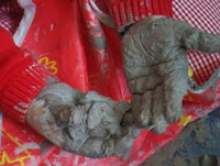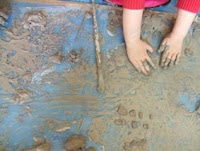 The children had fun painting a piece of clear perspex with clay slip, and sticking bits of clay on to make designs. Although some of them were hesitant to begin with, it wasn’t long before they got stuck in and started to paint their hands with the lovely slip as shown in this picture!