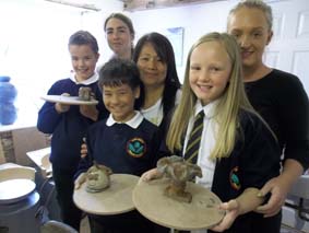 All x60 yr5 children from Marlbrook Primary School, Hereford visited the Pottery on friday as a creative ‘Summer’ outing. We can accomodate 30 children at a time so we split the group in two with x30 children working in the studio and the other half braving the deluge and walking on the Malverns. At lunchtime the groups swapped over.