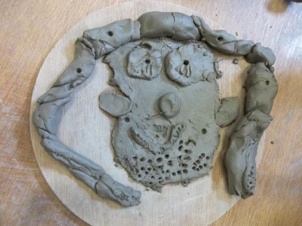 This beautifully modelled ‘happy’ face was made by a young child at Washwood Heath Nursery School in Birmingham. I was particularly taken by the detail: Cheeks, moustache, beard and eye lashes were all carefully added or drawn into the clay slab.
