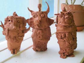 Each figure has been worked on by three students, each child making either a head, torso or legs. I took the body parts away and joined them in random fashion creating an army of fantastical creatures and hybrids – think of the drawing game consequences…but in 3d…made out of clay and you’ll get the idea.